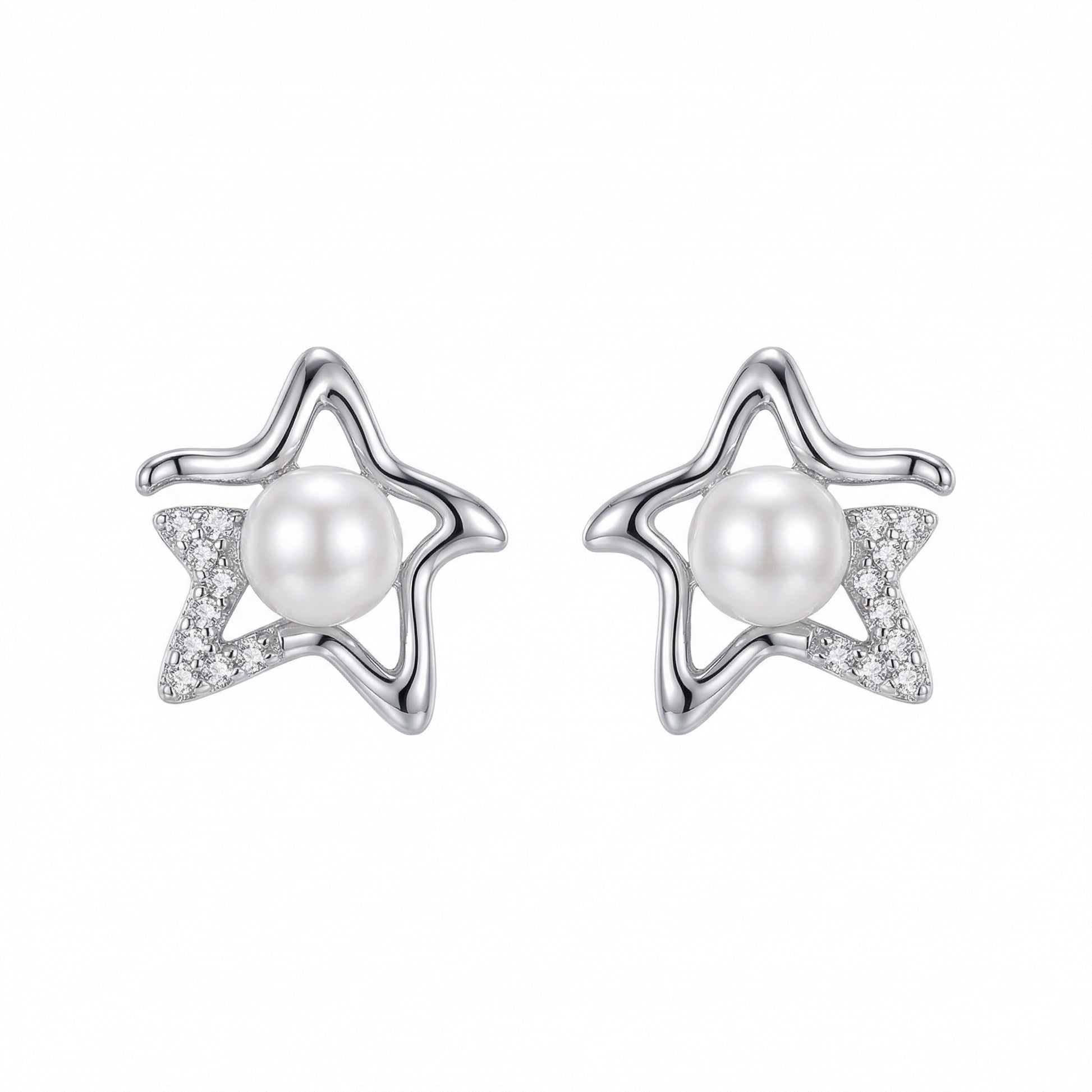 Elevate your everyday style with the Celestial Star Pearl Zircon Rhodium Earring. Crafted with a brilliant rhodium-plated finish, this elegant stud earring features a modern, open-star silhouette centered around a luminous simulated pearl. A delicate cluster of sparkling zircon stones accents one edge of the star, providing an eye-catching glimmer. Designed for comfort and longevity, these earrings are equipped with hypoallergenic 925 Sterling Silver posts, making them highly suitable for sensitive ears. Measuring approx. 1.5cm in width, this versatile piece offers the perfect subtle statement for both casual daytime outfits and sophisticated evening ensembles.