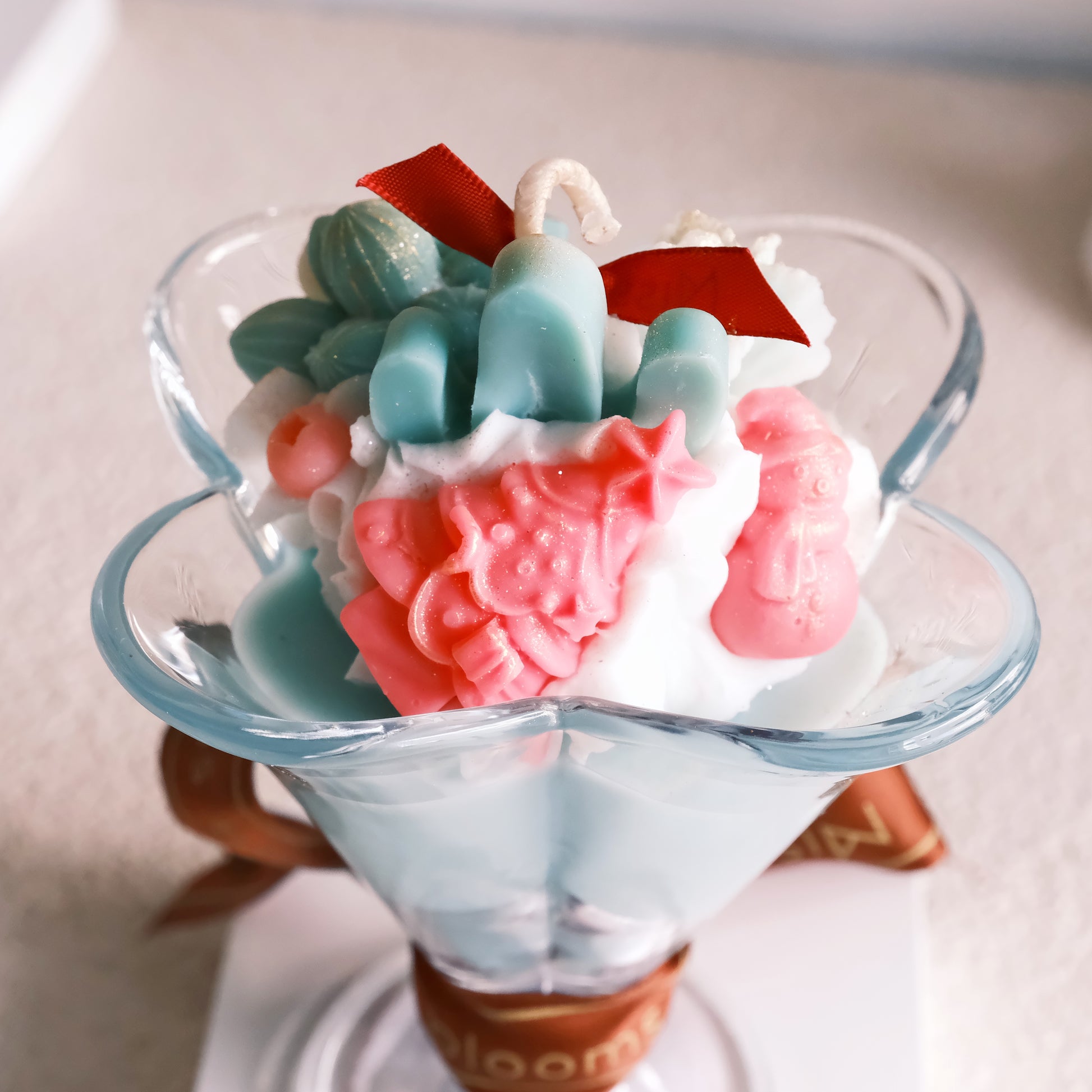 • Unique Dessert-Inspired Design: Shaped like a parfait in a glass, this candle features layers of soft mint-green wax topped with intricately designed wax ornaments and swirls of white, whipped-cream-like accents.