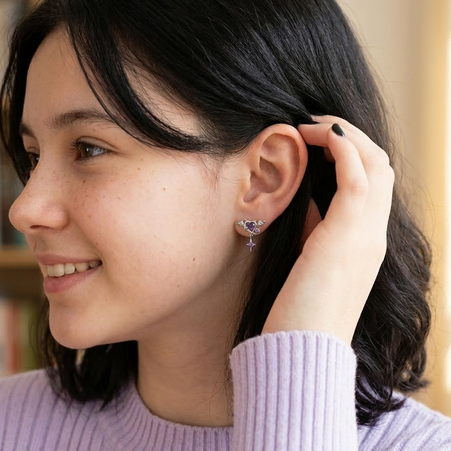 Gothic Bat Wing Purple Heart Zircon Rhodium Plated Earring